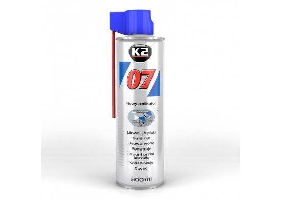 Το πολυ-λειτουργικό K2 - 07 περιέχει 7 συνθετικές δραστικές ουσίες ενωμένες σε ειδικό διαλύτη για εξαιρετική εφαρμογή. Το προϊόν επιτρέπει τη λίπανση και συντήρηση χωρίς αποσυναρμολόγηση, αποτρέπει τη σκουριά από εργαλεία που δεν χρειάζονται το χειμώνα, εξασφαλίζει άριστη στεγανοποίηση των καλωδίων ανάφλεξης και τα προστατεύει από την υγρασία. Το K2 - 07 χαλαρώνει κολλημένες βίδες, τροχούς καροτσιού, κλπ. και αφήνει ένα ευχάριστο άρωμα μετά τη χρήση.